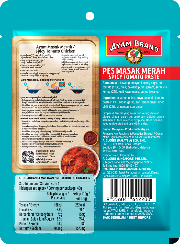 Made especially for fans of Masak Merah! Suitable to be used with chicken, meat and vegetables. All Ayam Brand Products contains no preservatives and no added MSG.